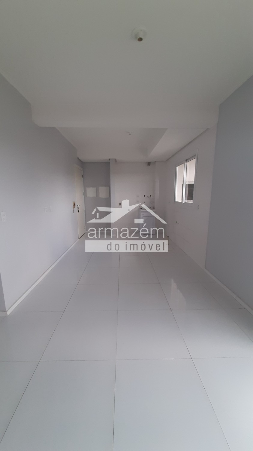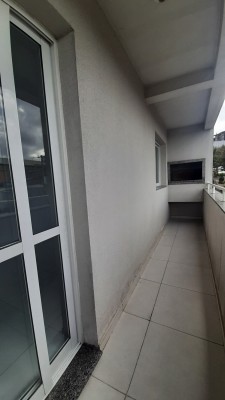 O imóvel conta com sala de estar integrada à cozinha, também com sacada e churrasqueira.